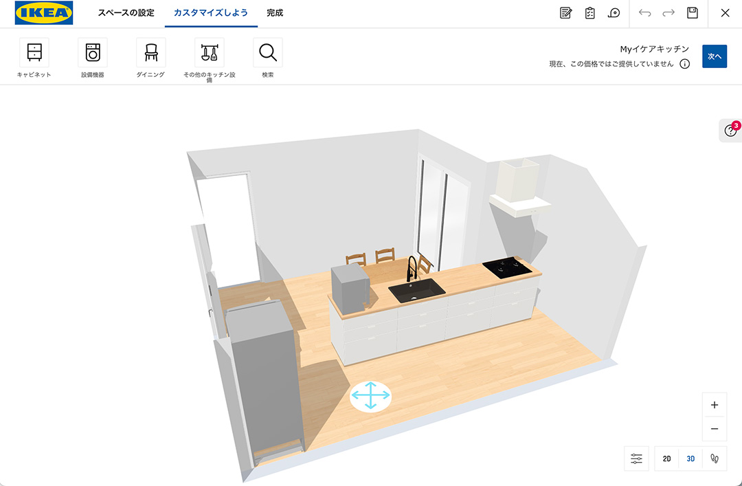 IKEAキッチンプランナーという、Web上の3D空間に施工現場を再現し、それに合わせたキッチンを配置しながらプランニングできるツールを使います。