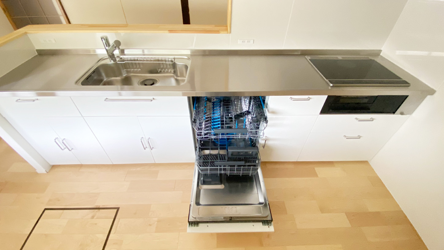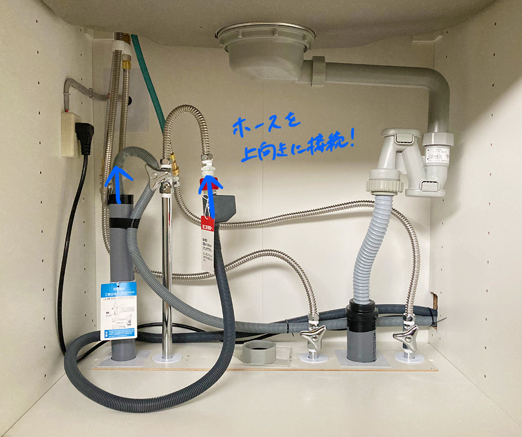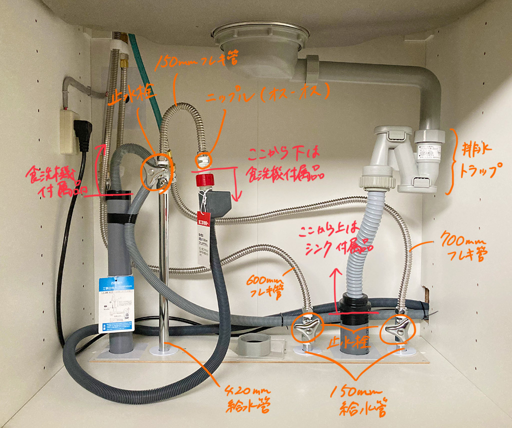 ※一般的な食洗機の排水管は、耐熱性の高いHT管などを使用するのですが、この食洗機は普通のVP管でOK、かつ、給湯は不要ということでした。