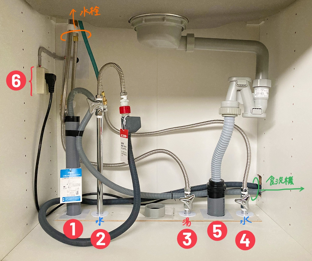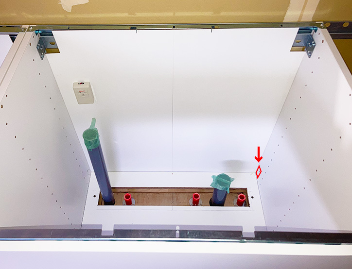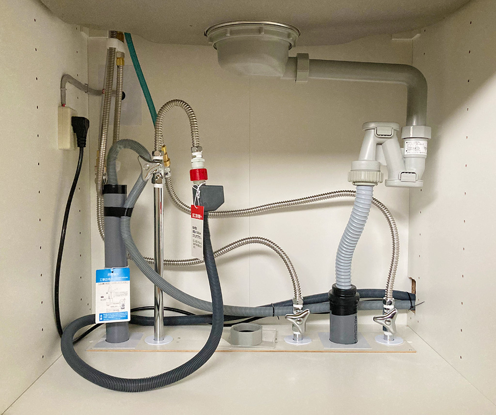 今回は左側に水栓を配置したかったため、食洗機の配管と干渉しないよう、水栓の配管を右側に寄せざるを得なかったのです…