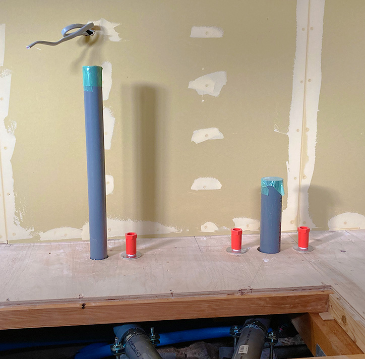 水栓用と食洗機用に分岐させ、それぞれ床出し、テストプラグをしておきました。