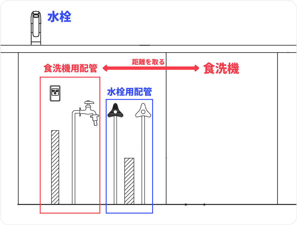 食洗機の仕様上の理由から「食洗機本体 〜 排水管・給水管 の距離をなるべく長くする」ことを推奨されました。