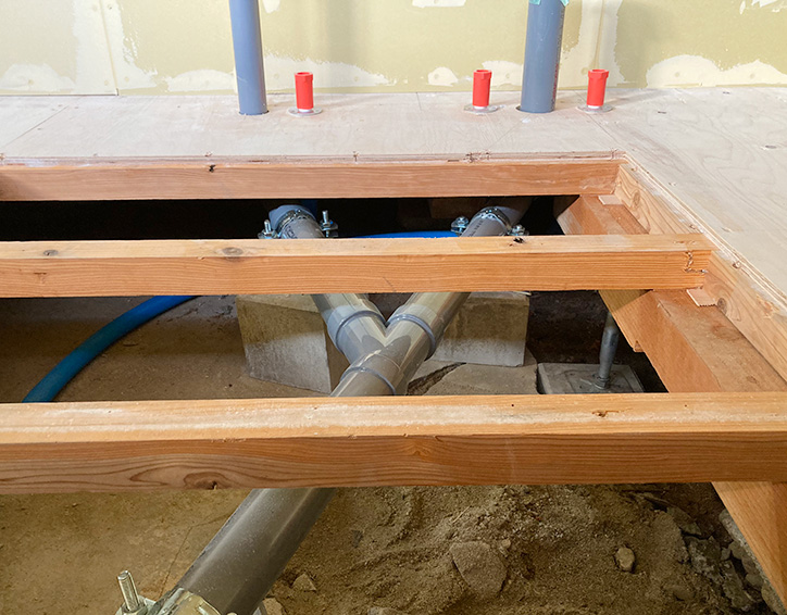 2/100勾配を確保しつつ、食洗機用とシンク用に分岐させました。