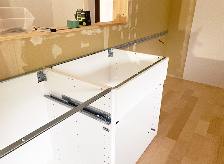 後々、水道配管がしやすいよう、一部分は合板を貼らず、配管後にビス止めしました。