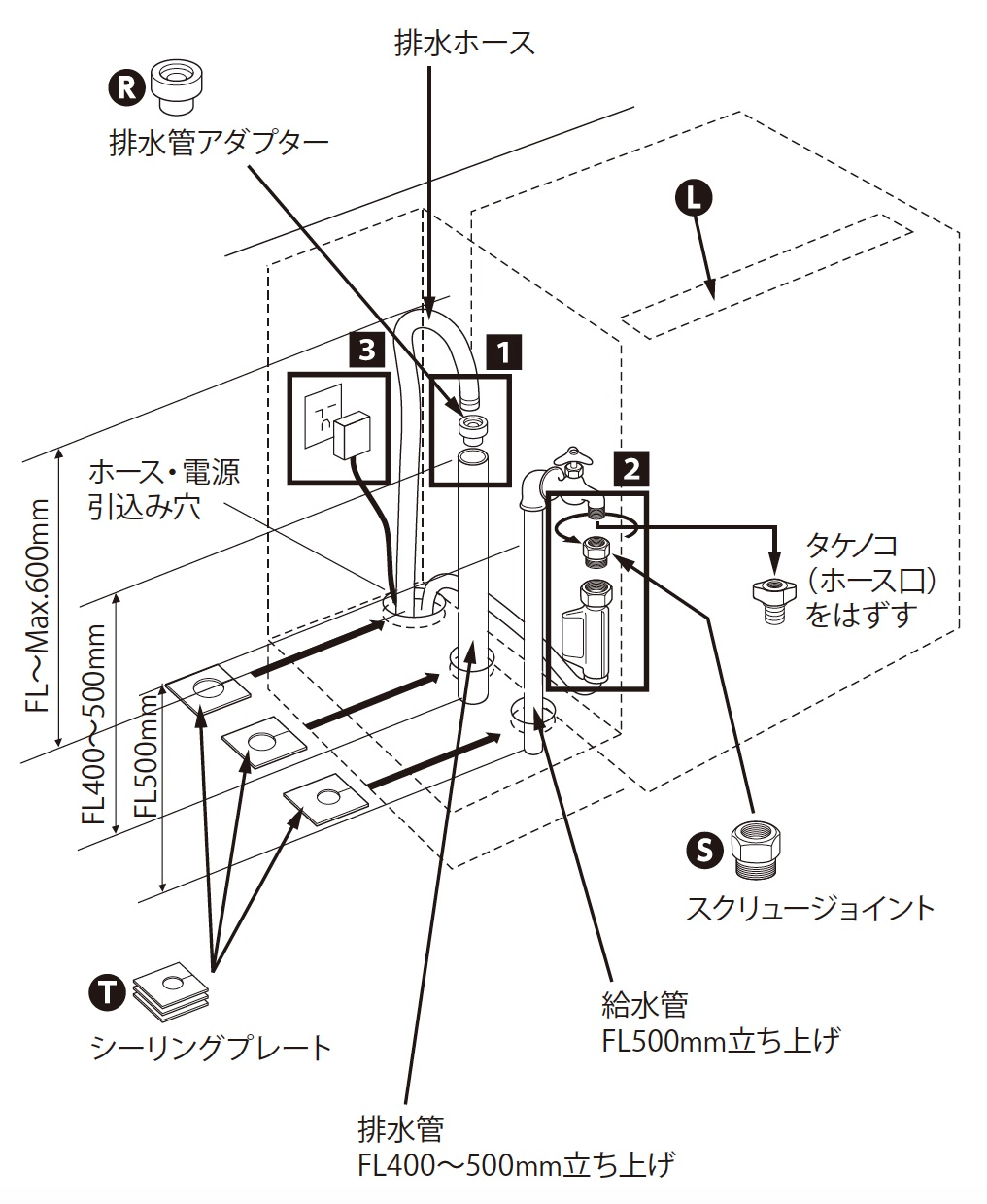 - 給水床立ち上げ:150mm ストレート止水栓 + フレキ管