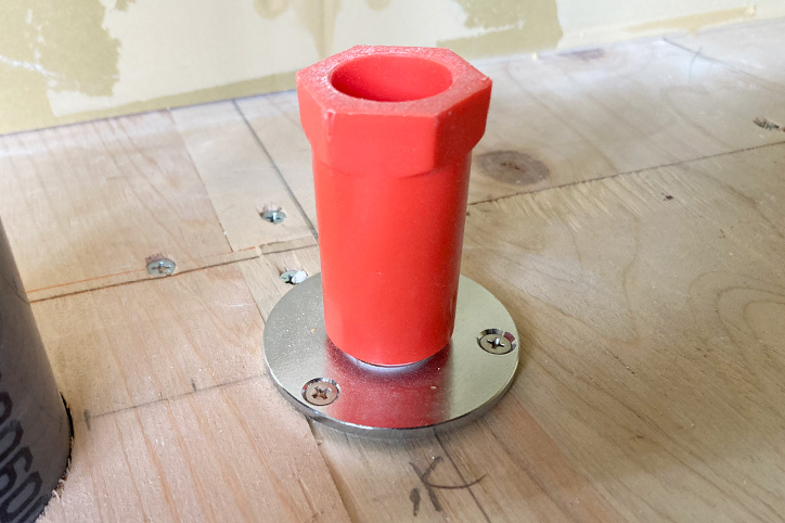 配管付近にはフローリングを貼らないので、床出しのソケットは、そのまま合板にビスどめしました。
