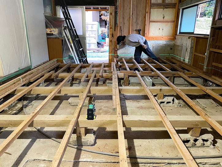レベルが悪いのと、水道配管の位置と干渉したため、根太からやり直しました。