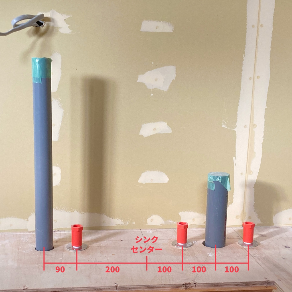 今回はシンクの右側に食洗機を配置するため、食洗機用の配管はなるべく左側に寄せて距離を稼ぐことにしました。