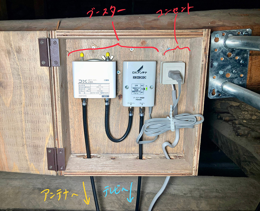 今回はメンテナンスのことも考えて、ブースターとコンセントをまとめるボックスを、合板でサクッと作成してみました。