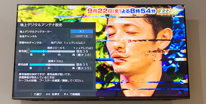 - テレビの設定画面から受信強度のテストを行う